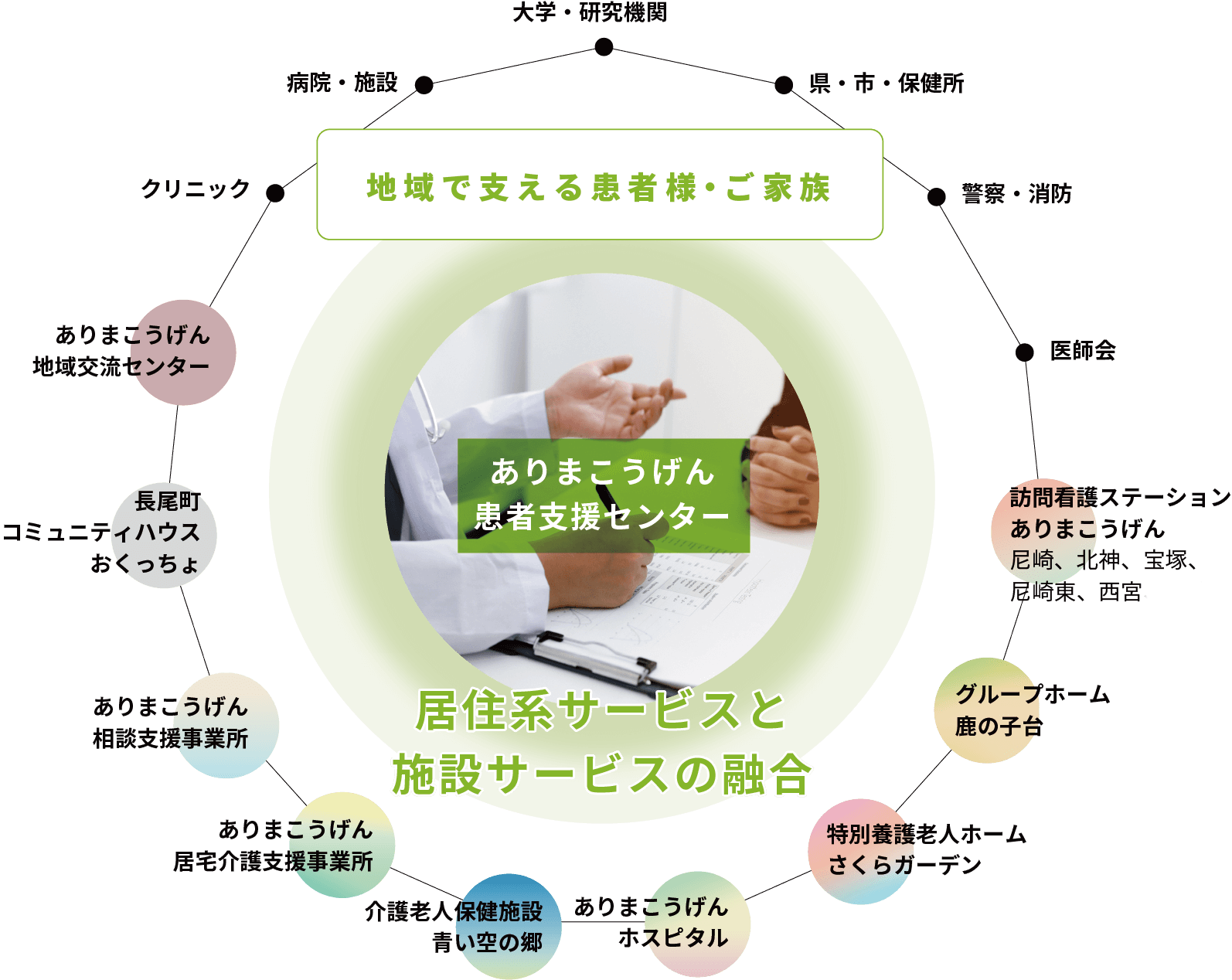ありまこうげん患者支援センターは多職種が連携し、患者さま、ご家族、地域の皆さまのご要望に寄り添いながら各種ご案内・支援に取り組んでいます。